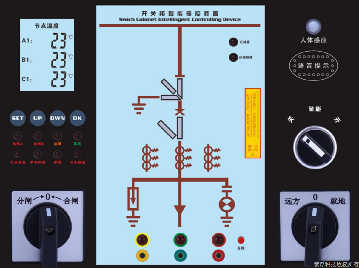 开关柜智能操控装置是用于3~35kV开关柜上的一种多功能、智能化模拟动态指示装置。除具有一次回路模拟图、开关状态、断路器位置、接地闸刀位置、弹簧储能状态、高压带电指示、加热器故障指示等指示功能外,还具有人体感应、柜内照明、语音防误提示、远方/就地、分合闸等操作功能。适用于中置柜、手车柜、固定柜、环网柜等多种开关柜。